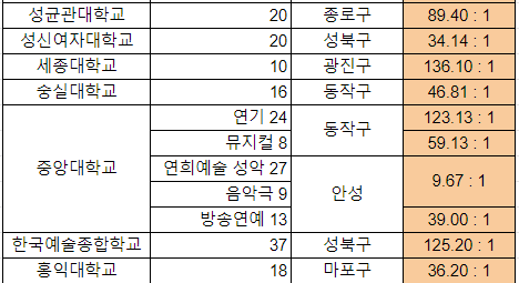 세종대, 중앙대, 한예종은 엄청난 경쟁률을 보여주네요..