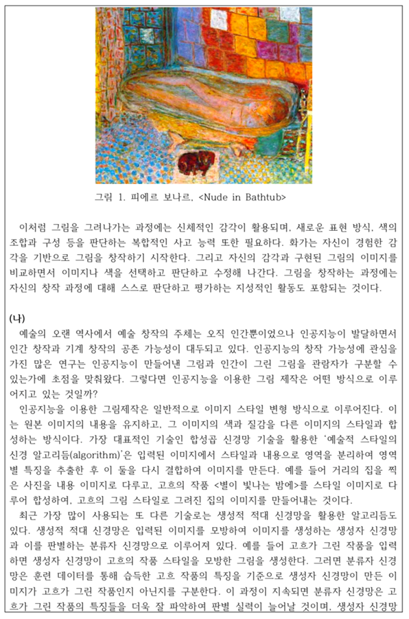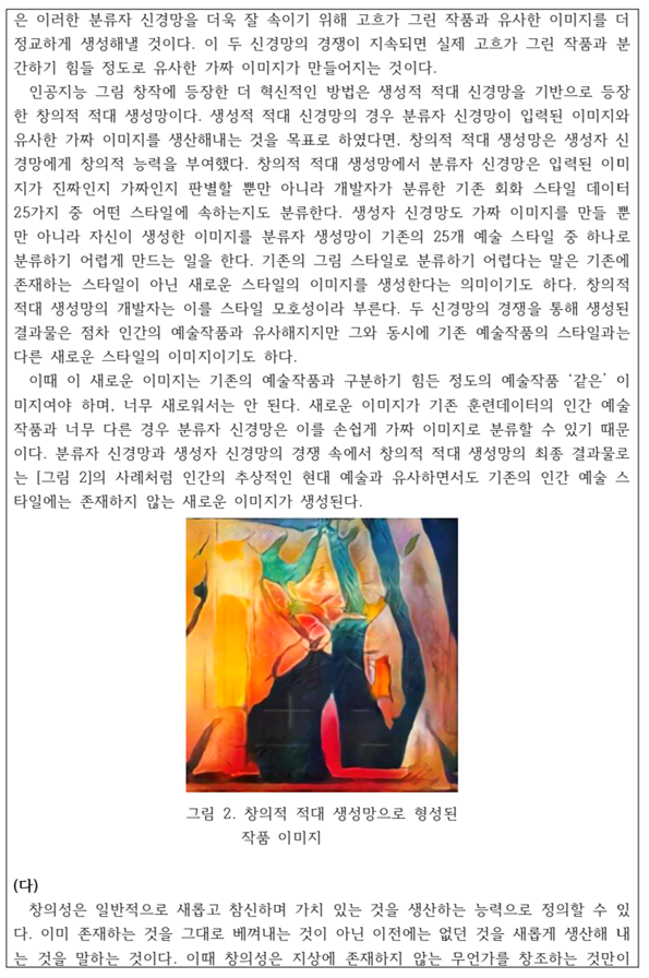 [문제] (가)와 (나)를 중심으로 인간과 인공지능의 창작 방식을 비교하고, (다)를 바탕으로 인공 지능의 그림 창작이 지닌 창의성과 그 한계를 논하시오. (1,000자)
