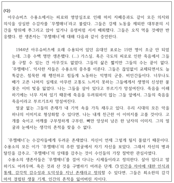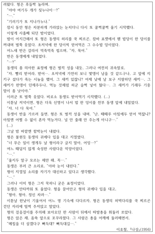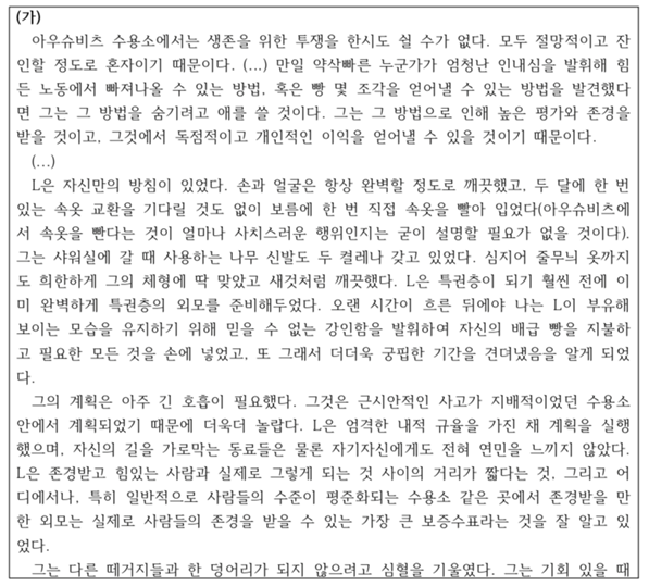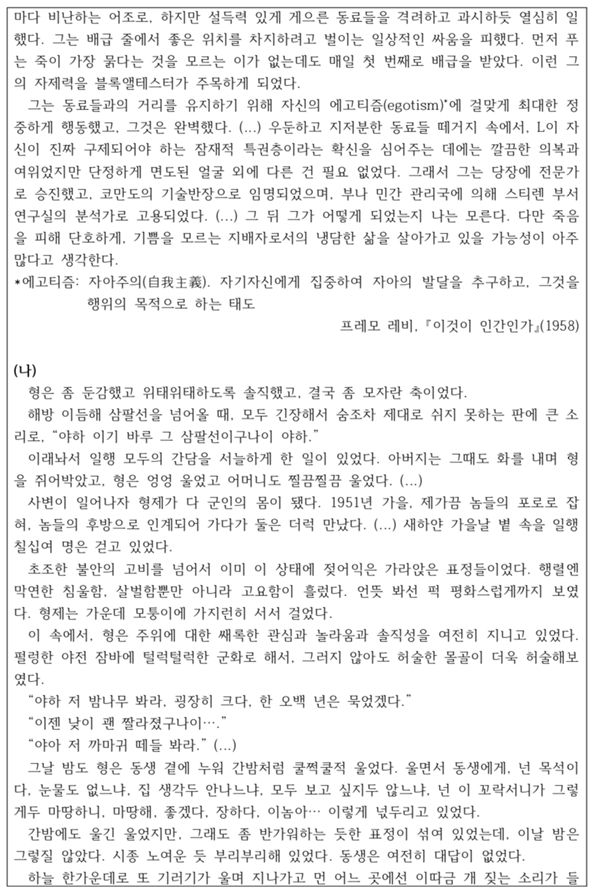 [문제] (가)의 'L'과 (나)의 '형'이 처한 상황을 요약한 후, ㄱ의 관점에서 (가),(나)를 (다)와 비교하여 논하고,
